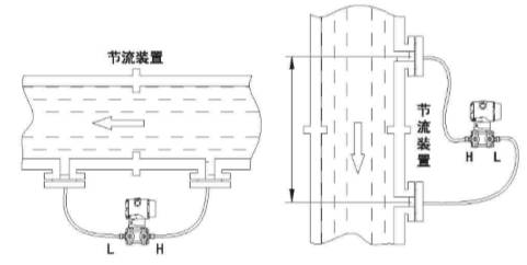對(duì)不能用導(dǎo)壓管引出的介質(zhì),可用雙法蘭差壓變送器進(jìn)行流量測量,其裝置見下圖,測量水平管道時(shí),兩法蘭同在一水平面上,不存在液位差,不考慮遷移,測量垂直管道是,始終承受(r-r0)H的液位壓差故儀表應(yīng)有(r-r0)H正遷移量。
