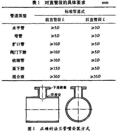 流體在方向、管徑以及閥門開度變化時,會產生渦流和流場畸變,這樣會對傳感器電極的測量產生影響,從而影響儀表的精度。所以要盡可能地離開彎管、手閥、調節(jié)閥等部件一定距離,直管段的具體要求見表l。表中,D表示管道通徑,L表示傳感器到閥門或彎頭等部件的距離。