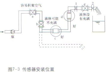 ??? 智能電磁流量計(jì)在垂直安裝時(shí),流動(dòng)方向應(yīng)該自下而上,這樣才能確保傳感器始終充滿介質(zhì)。推薦的安裝位置如圖7-3中c、d所示。