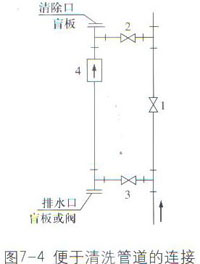 智能電磁流量計(jì)不管是水平安裝或者是垂直安裝,在連續(xù)生產(chǎn)的工藝管道上,為了不影響生產(chǎn),便于儀表維修拆裝,傳感器盡可能采用與原先主工藝管道并聯(lián)安裝(旁路管)的方式,特別對(duì)有嚴(yán)重污染要經(jīng)常清洗的液體。圖7-4所示是傳感器不卸下,在線清洗安裝實(shí)例。