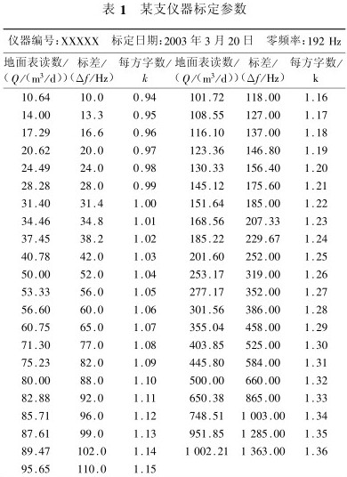 電磁流量計(jì)是一種直接測(cè)量流體流量的儀器,因此所測(cè)流量可直接讀取。而用渦輪流量計(jì)求取流量時(shí),首先需要經(jīng)過(guò)大量的線性回歸和公式計(jì)算,計(jì)算煩瑣且精度不高,給資料的解釋工作帶來(lái)較大難度。電磁流量計(jì)一般要經(jīng)過(guò)標(biāo)定才能在現(xiàn)場(chǎng)應(yīng)用,某支儀器的標(biāo)定參數(shù)見表1。