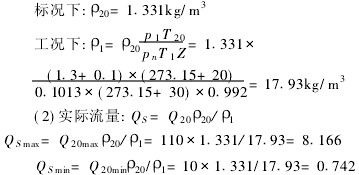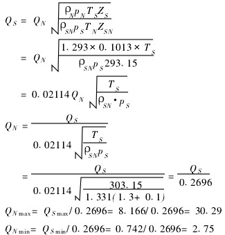 式中:ZS(ZSN)為被測氣體在標準狀態(工作狀態)下壓縮系數(一般情況ZSUZSN);QS為工況下氧氣的實際流量;QN為標況下空氣的實際流量;QN為標況下空氣的密度(11293kg/m3);pN為標準大氣壓;TN為標準溫度293115K;QSN為標況下氧氣的密度(即Q20);pS為氧氣實際工作壓力(即p1);TS為氧氣實際工作溫度(即T1)。