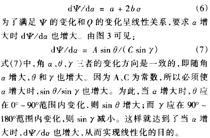 連桿8、9、10的長度分別為A、B、C,連桿8與平衡桿6固定在一起,指針與連桿ro固定在一起。要求轉角少的變化和流量Q的變化呈線性關系,這樣可用d空代替d口,用da代替d人,代人公式(5)得
