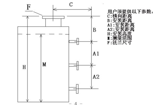 | B | 有導向索2根 |  |  浮標液位計安裝調試1、按照兩個導向滑輪的間距,在容器.上方開三個孔,分別焊接導向螺栓管和滑輪導管;在容器外側焊接標尺支架,高度以保持兩個導向滑輪水平為準