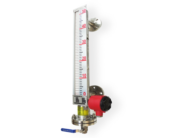 磁翻板液位計主體外的翻板箱受主體內浮子(具有定向磁性源,按不同介質和壓力針對訂貨)的作用促其翻板翻動并顯示紅白顏色,并隨浮子的移動指示不同的液面高度,紅色始終表示液位的高低。在指示器左側配有醒目的刻度標尺,從而使液位的指示顯得更加清晰。