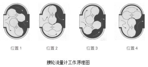 智能氣體腰輪(羅茨)流量計,主要由殼體、共軛轉子、計數器和智能流量轉換器等部件構成。裝于計量室內的一對共軛轉子在流通氣體的出入口壓差(P入>P出)作用下,通過精密加工的調校齒輪使轉子保持正確的相對位置。轉子間、轉子與殼體、轉子與墻板間保持最佳工作間隙,實現了連續的無接觸密封。轉子每轉動一周,則輸出四倍計量室有效容積的氣體,轉子的轉數通過磁性密封聯軸裝置及減速機構,傳遞到智能流量轉換器,從而顯示輸出氣體的累計體積量。其計量過程和工作原理如圖所示(圖中僅表示了四分之一周期)。