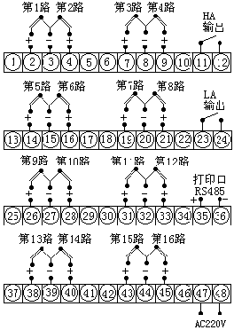 報警輸出: ⑴1-64通道統一上下限報警,繼電器輸出觸點容量 AC220V/3A