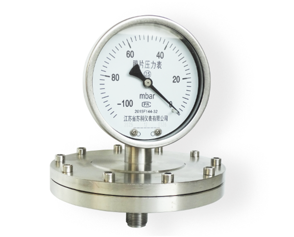 膜片壓力表由測量系統(包括法蘭接頭、波紋膜片)、傳動指示機構(包括連桿、齒輪傳動機構、指針和度盤)和外殼(包括表殼和罩圈)等組成。膜片壓力表外殼為防濺結構,具有較好的密性,故能保護其內部機構免受污穢浸入。